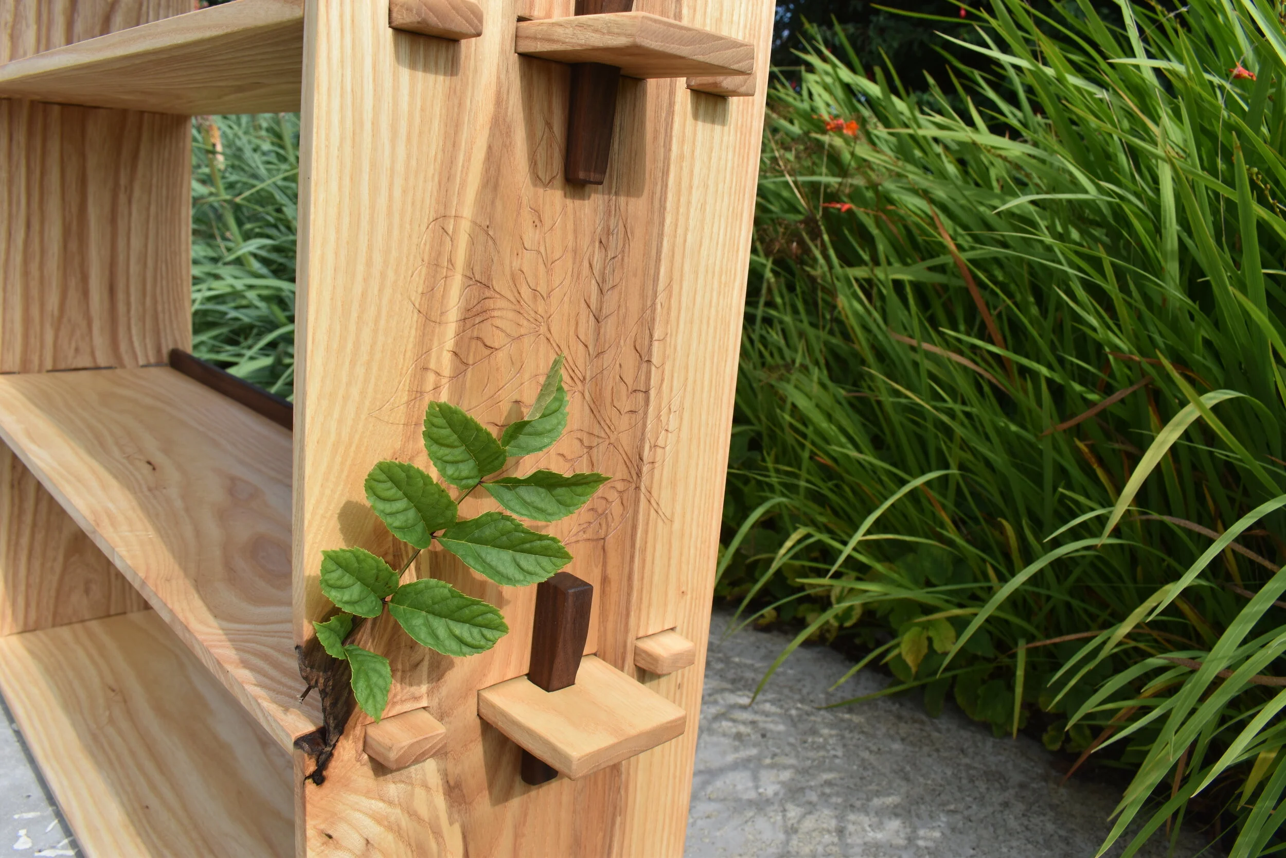 Ash & Walnut knockdown bookcase with Ash leaf carving.
